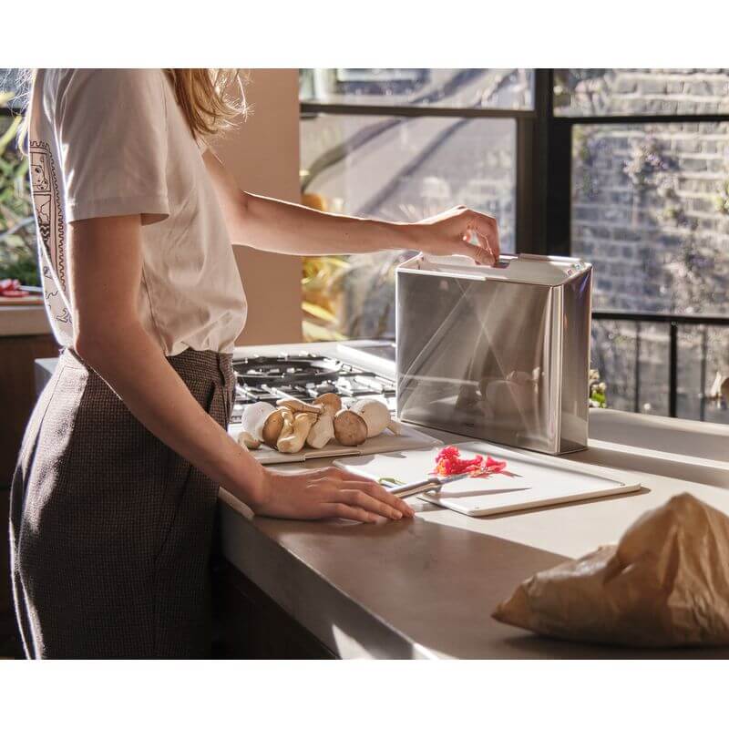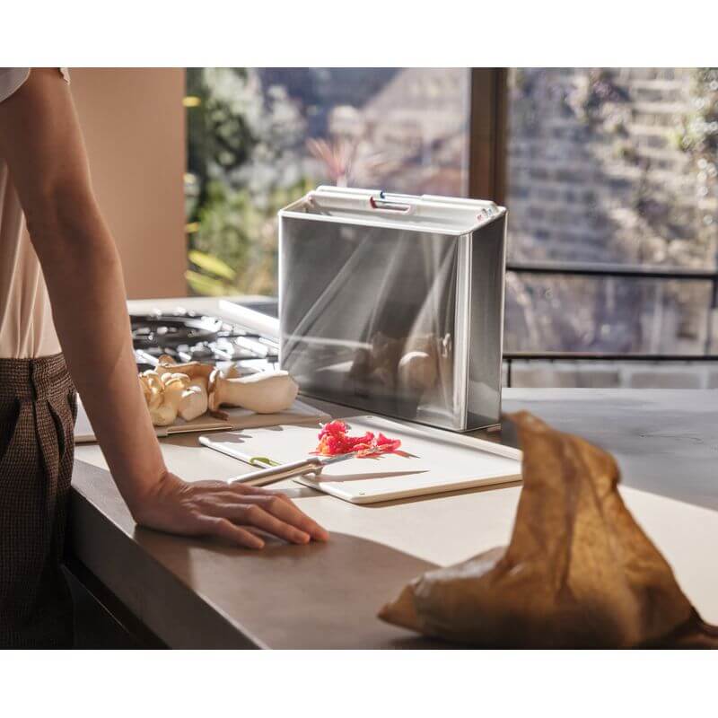 Each chopping board has a textured, knife-friendly surface and non-slip feet for stability. The angled stainless-steel case isn’t just sleek—it’s fingerprint-resistant, easy to clean, and designed to improve airflow, so boards dry quickly between uses.