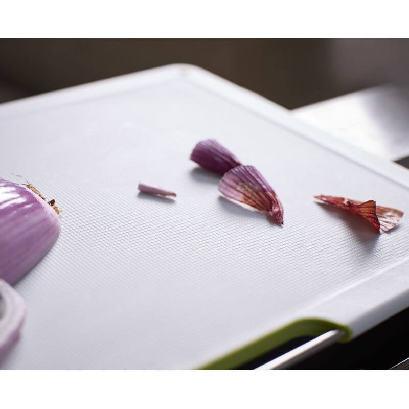 Designed for modern kitchens, this stylish Joseph Joseph Folio 4 Piece Stone Chopping Board set keeps food prep organised and hygienic. It features four colour-coded chopping boards to help prevent cross-contamination.