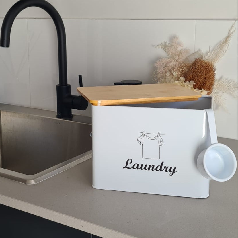 Freshen up your laundry with the Laundry Powder Tin in White with Bamboo Lid. Say goodbye to unsightly detergent boxes and messy spills with this elegant and practical storage solution.